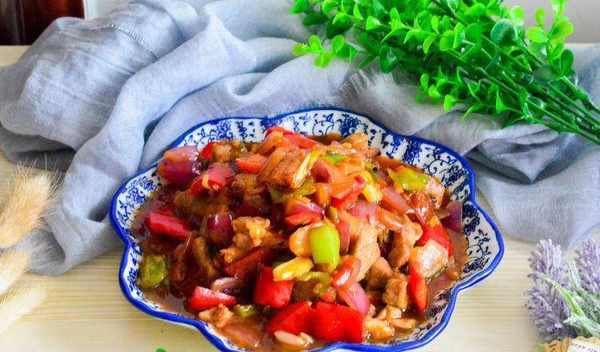 原料:洋葱1个,瘦肉150克,红甜椒1个,青椒1个;材料:洋葱1个,切碎,糖1茶匙,醋1茶匙,酱油1茶匙,蒜瓣2瓣,姜2片,酒适量,盐少许,2汤匙。豆瓣酱、植物油适量