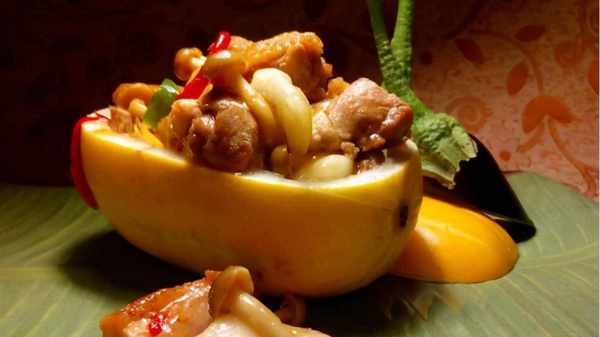 3、南瓜去籽,切成船形,入笼浸泡半小时。将蒸好的肉放在蒸好的南瓜上,用大蒜调味,淋上热油,与酥皮一起食用。