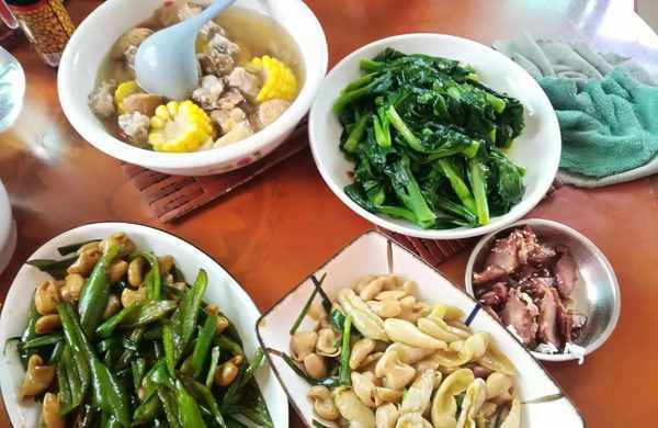 午餐还有一道白灼菜心,因为女儿还小,吃不了猪大肠,所以婆婆还去熟食店买了点儿叉烧。中午婆婆还煲了玉米排骨汤。平常我家就是这样荤素搭配着吃的,有荤有素又有汤。