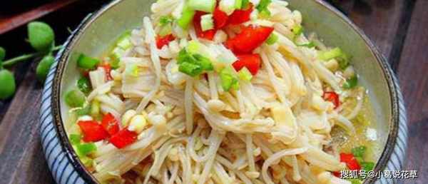 材料:新鲜金针菇500克,小葱适量,红辣椒碎少许。调味盐1/2茶匙,味精1/2茶匙,白糖少许,白醋少许,春油2茶匙。