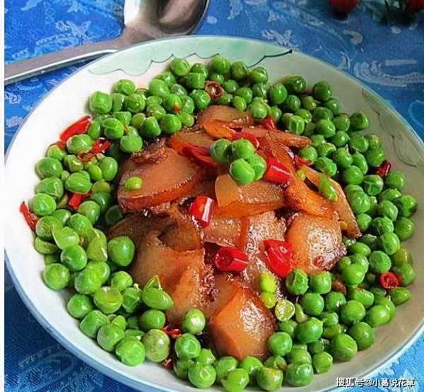 3、锅里放油,腊肉炒香,捞出,锅里留底油,下干辣椒,炒,下青豆炒,加酱油,蚝油,下腊肉一起炒,加入鲜汤,加入蒜叶,用文火煮一会,然后从锅中取出