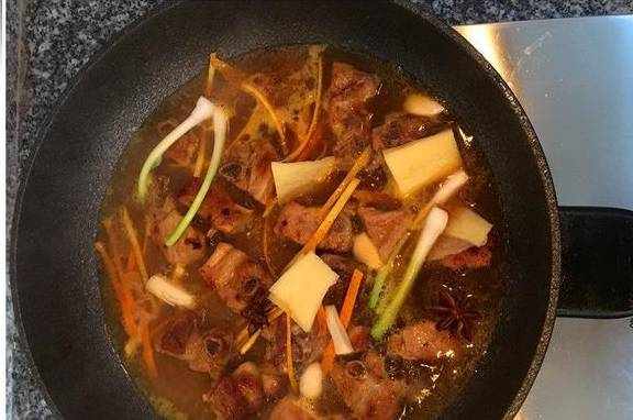 5、待排骨表皮微黄,加入酱油、蚝油上色,随后倒入准备好的高汤、橙汁、葱白、姜片、蒜粒、八角、橙皮,大火烧开转小火焖煮;