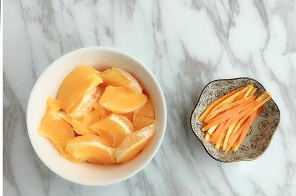 2、橙子用食盐揉搓洗净,皮肉分开装置(橙皮去除白色部分,流出些许橙皮焖煮时用);