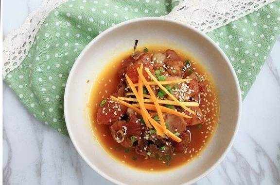 辅料:姜1块、蒜粒3颗、葱花5g、八角2颗、料酒1汤匙、酱油2汤匙、蚝油1汤匙、盐油适量