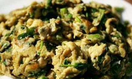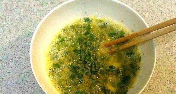 捞出过凉水浸泡,滤干水份。切碎,打入鸡蛋,拌匀备用。用前先放盐,不能早放。
