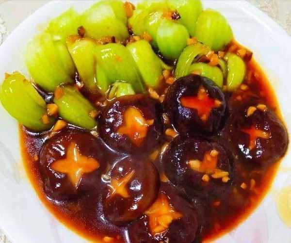 原料:青菜200克、香菇200克、生抽、白糖、香醋、蒜末、姜末、淀粉适量
