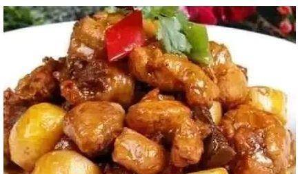 4、锅内倒入少许油,放入葱姜末炒香,放入鸡块,加料酒、酱油、盐、糖少许5.加入适量的水,用大火烧开,然后转小火,用文火把鸡块煮熟。加入栗子继续煮至鸡块和栗子酥脆,用大火收汁,留下一些汤汁即可关火