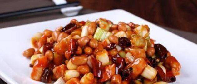 原料:猪肝200克,炒花生米75克,混合油75克,花椒10粒,干辣椒8克,盐3克,料酒13克,味精3克,20克酱油、湿淀粉20克,葱、姜、蒜、白糖各8克,汤适量,醋少许。