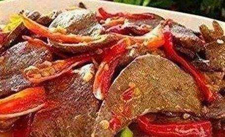 3.烧热勺子,倒入油。油热后,先放入辣椒和花椒,炒至紫黑色,然后放入猪肝片,将汁倒入勺中,待猪肝熟透后,榨出汁液,翻炒片刻,淋上醋,下入炒好的花生米即可。