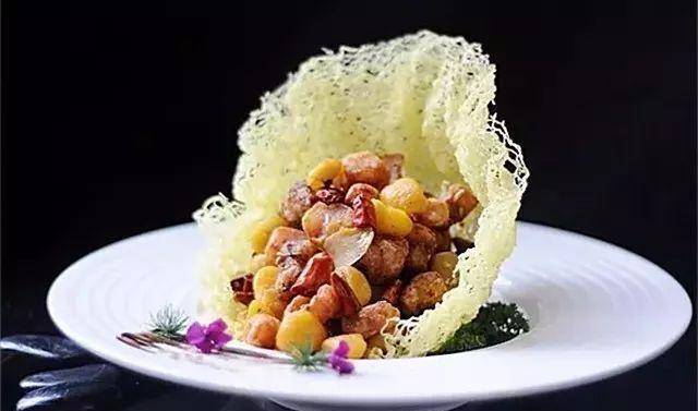 3、锅内放炸辣椒油,加入姜片、蒜片、干辣椒块、花椒、茴香炒香,再加入松阪肉丁和栗子拌匀,加入盐、鸡精香精和味精调好味儿,起锅放入盘中的米目中,就完成了。