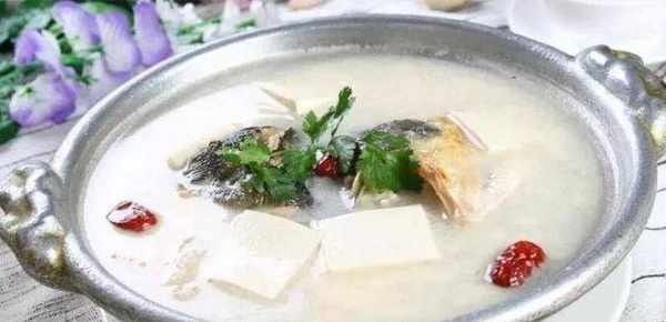 8.将鱼头汤放入锅中,撒上青蒜装饰。
