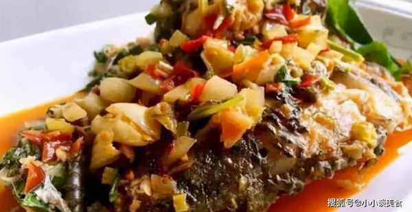 2.干净的平底锅烧热植物油,加入姜蒜、醋椒末、花椒末、泡菜末、豇豆末和小米椒煸炒出香味,加入适量的鲜汤,盐,加糖和谷氨酸钠。将酱汁稍微勾芡,淋在鱼身上,撒上葱花,香菜和小米辣椒粉。