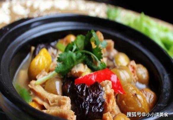 4、加水,放入蒸熟的栗子,再加入盐、香菇粉、酱油、胡椒粉,调好味,加几滴香油;