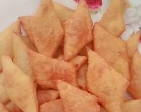 然后把面团擀成一片,用刀切成菱形小片。热锅加入食用油,油温5成热,下入切好的面片,小火慢炸,炸至表面金黄即可。