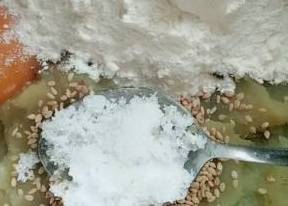 再打入一个鸡蛋,一勺白芝麻,再加入一勺白糖和适量面粉以及一勺食用油,揉成面团。揉成面团之后,醒十分钟。