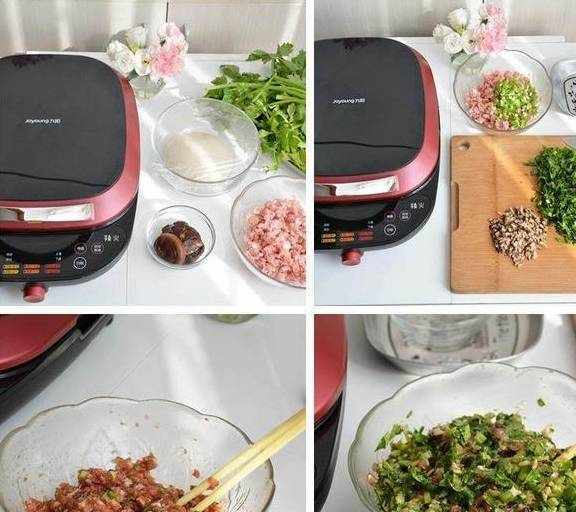 材料:芹菜叶1棵,香菇4朵,猪肉馅适量,油适量,蚝油20克,酱油10克,盐2克,黑胡椒粉2克,香葱4棵,柔软面团1块