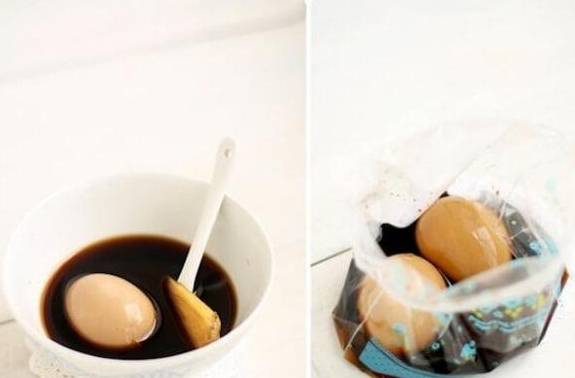 这是在日本吃水煮蛋最美味的方式之一。先将鸡蛋在开水中煮大约5分钟,同时把酱油、味醂、水和红糖混合一起制成卤汁。之后,让已经半熟的水煮蛋冷却,然后剥掉蛋壳。再小心地将它们转移到一个塑料袋或容器中,最后加入先前准备的卤汁冷藏过夜。你可能需要偶尔翻动一下鸡蛋以确保它们能够均匀地沾上卤汁。