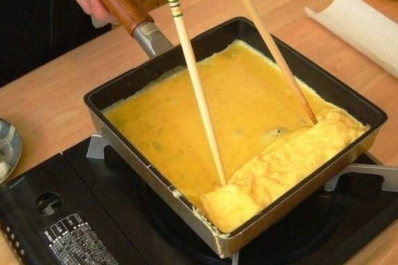 与制作明石烧不一样,制作日本传统的玉子烧时,会使用一个特殊的矩形煎锅。这种煎锅被称为「巻焼き锅」或「玉子焼き锅」,因为传统的玉子烧是把鸡蛋一层一层叠起,再卷成长方形的形状。