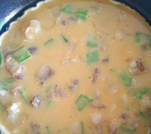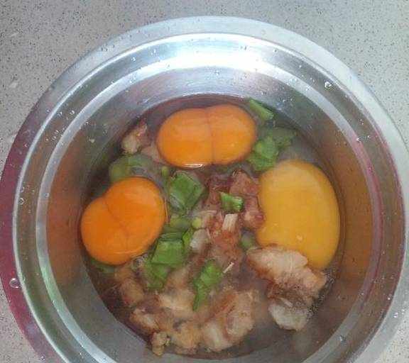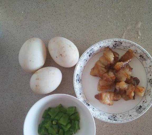 鸭蛋三个、荷兰豆少许、猪肉(肥)少许、精盐少许、胡椒粉少许、料酒一小勺、生抽适量、食油适量