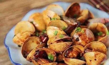 2.将锅烧热,放油煸香干辣椒,将滤净水的蛤蜊倒入锅中