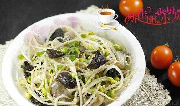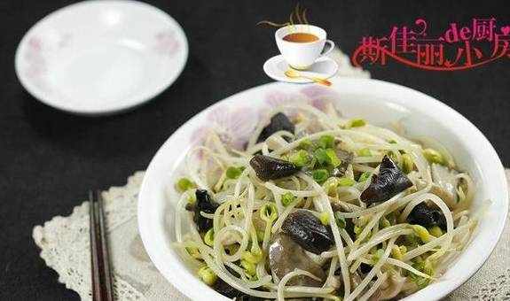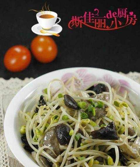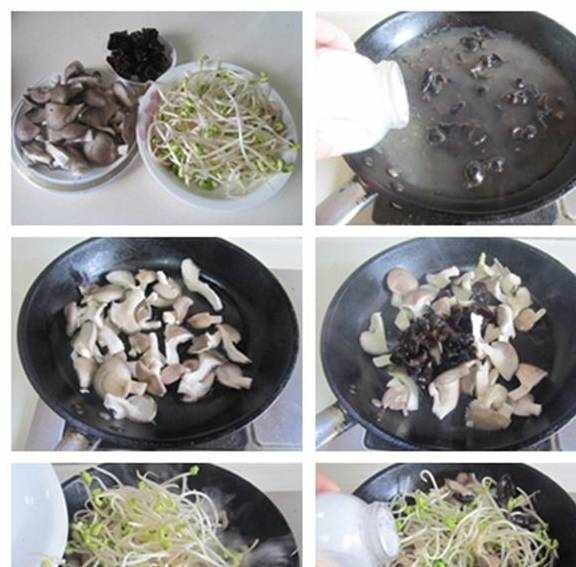 原料:黄豆芽1盘平菇1小盘木耳1小把油盐适量