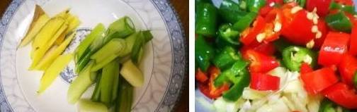 3、接着把姜切丝,葱切段,青红辣椒切丁,蒜切末;