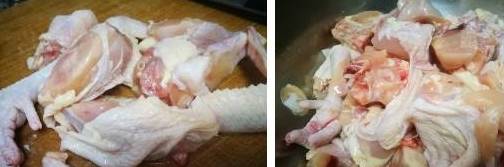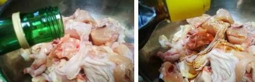 2、然后把鸡块去污血,清洗干净,沥干,倒白酒,酱油备用;