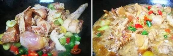 6、最后把鸡块翻炒至鸡皮发金黄色,加温水刚好没过鸡肉,大火烧开,小火咕嘟咕嘟20分钟,慢慢收汁即可出锅!