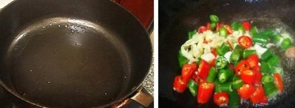 5、热锅放油,下青红辣椒丁蒜末煸香,炒至出香味,加鸡块,翻炒;