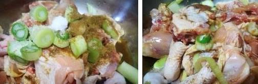 4、在鸡块上放葱段,五香粉,少许盐,将调料和鸡块充分搅拌均匀即可;