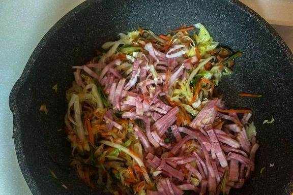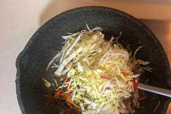 5.接着我们放入圆白菜丝翻炒,可能提交比较庞大不好炒,不过还是要用力翻炒均匀哦哈哈!