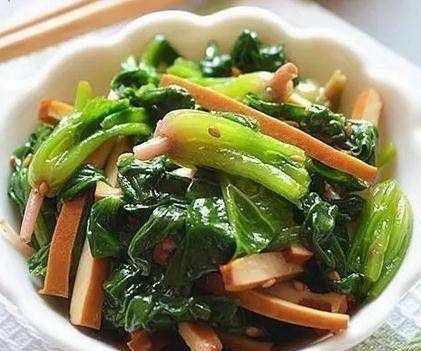 配料:菠菜200克,豆腐干3块,盐适量,味精适量,辣椒油适量