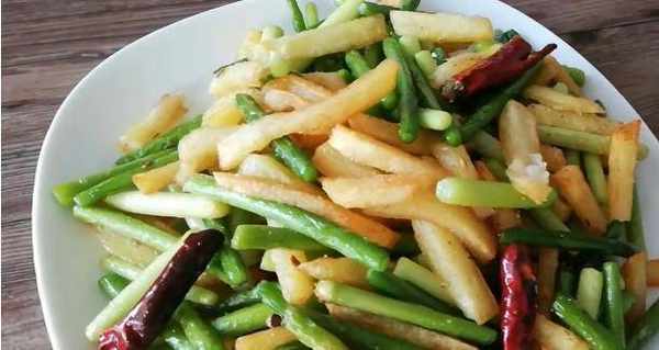 3、油温升起后,再次炸土豆条,锅中留底油,加入花椒、大料炒香,加入蒜苔翻炒,倒入准备好的碗中果汁。倒入薯片翻炒。