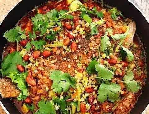 8.将烤鱼放在锅中的白菜和金针菇上,加入切碎的洋葱、辣椒块、黄瓜块、芹菜和香菜