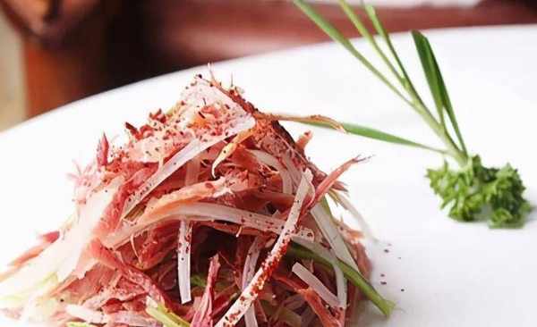 将野猪后腿肉放入一锅清水中煮至熟透。拔出来撕成条后,加入香菜结和葱丝,拌匀装盘。最后撒上少许辣椒即可上桌。