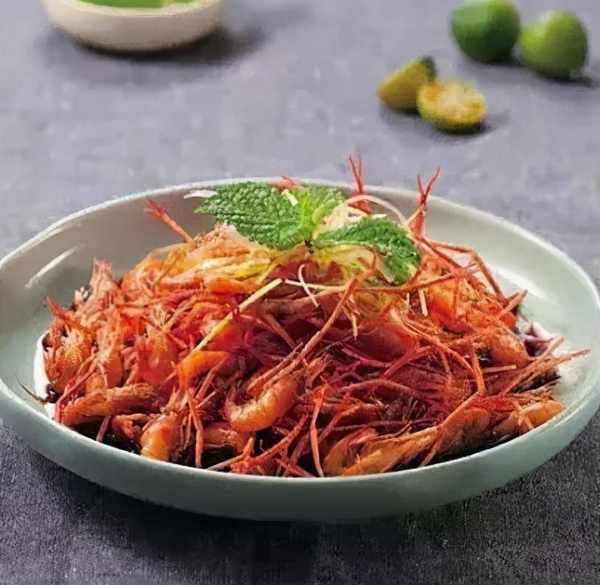 2、80%热油锅将河虾炸至壳酥,捞出,再炸一次捞出。3.锅留底油,加入葱姜片爆香,加入调好的酱汁烧开,加入河虾翻炒几下,挤少许青橙汁入锅出锅前翻炒均匀时间,即可以装盘。
