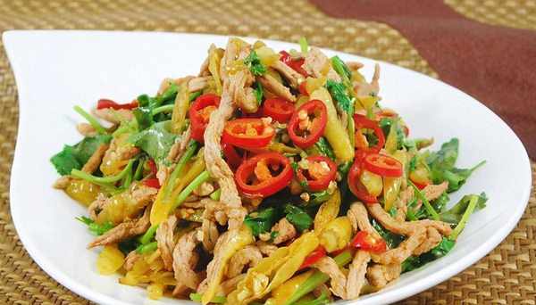 5、另取一锅,加入少许油,油热后放入五彩丝翻炒。