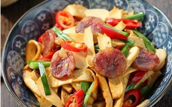 材料香肠1根,香干4条,韭菜1小把,红辣椒2个,极鲜1勺,蚝油1勺,油适量,盐适量。