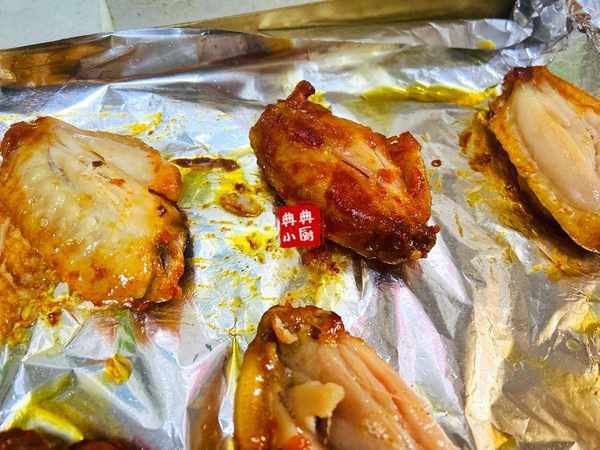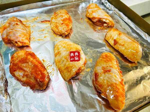 把腌制好的鸡翅一一放到烤盘里面,大家做的时候可以下面刷点油,我这个没刷,所以烤的时候翻面就翻车了。