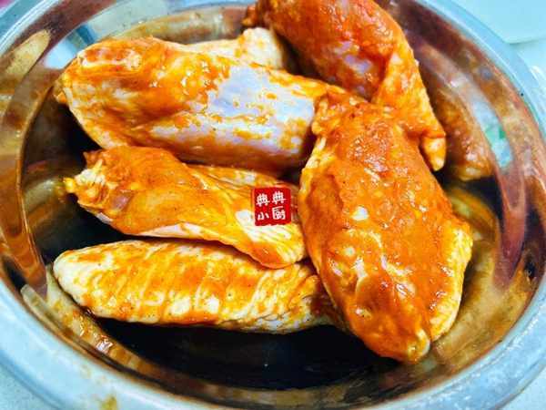 鸡翅洗干净之后用牙签在表面扎些小孔,方便腌制的时候入味。加点烧料,一点清水腌制两个小时以上,或者提前一天腌好放冰箱里面放入味。