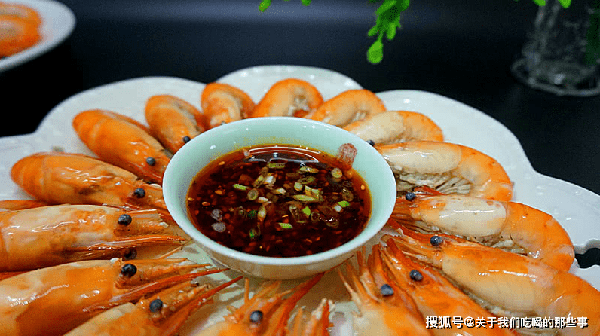 2、放入大虾,加一勺料酒,大火煮至大虾变红就可以捞出了,放入冰水中浸泡5分钟,口感更加紧实Q弹。生姜切末,加入食盐、生抽、香醋、香油、辣椒油搅拌均匀,水煮虾剥壳后蘸着料汁吃即可。