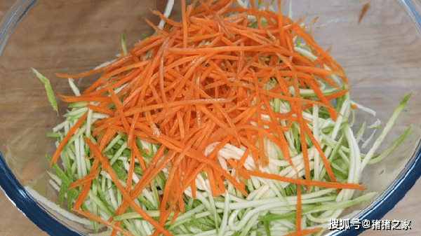 1.准备两根西葫芦,切去头和尾,然后用擦丝器擦成丝;一根胡萝卜也擦成丝;全部都擦成丝后一起放入一个大碗中,加入少许的盐,抓拌均匀,腌制5分钟。