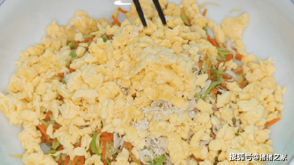 4.西葫芦丝和胡萝卜丝腌制好后把它的水分挤干,尽量把水分挤得稍微干一些,然后放在案板上,用刀稍微切一下,不用切的太碎。然后放入一个大碗里面,加入一些虾皮和炒好的鸡蛋碎,再加入少许盐、鸡精、香油,用筷子搅拌均匀,备用。