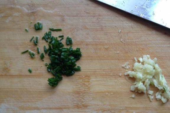 然后准备佐料,葱切碎,蒜捣碎