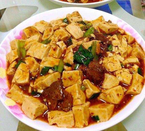 麻婆豆腐:豆腐切丁,锅内加少许菜油,大火加热,油热后依次加入豆瓣酱、盐、干红辣椒、青蒜、姜末、花椒粉,炒香,加入切成小块的豆腐,加入水。改小火,煮沸,待豆腐熟后,改大火,加入由水淀粉、糖、酒、味精、酱油调好的芡汁。待芡汁均匀附着后,关火,起锅,撒上花椒面,香喷喷,川味十足的麻婆豆腐上桌啦。