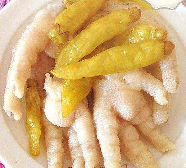泡椒鸡爪:新鲜鸡爪洗干净砍掉指甲,烧开水放料酒和花椒去腥,放鸡爪下去煮8分钟,可以用筷子插下没有血水就熟了,捞起来砍开三节,开水龙头一直冲洗,洗到没有油份最好,用冰水激下鸡爪,爽脆就靠这一步啦,准备好泡椒、蒜头、米椒,鸡爪捞起来装盘子里,倒放泡椒和泡椒水,加入蒜头、米椒、味精、盐、醋,最后倒入凉开水直到腌满鸡爪。
