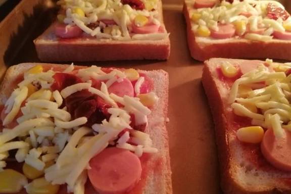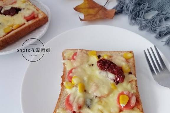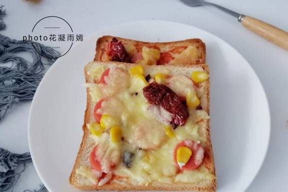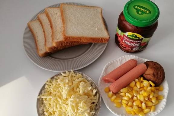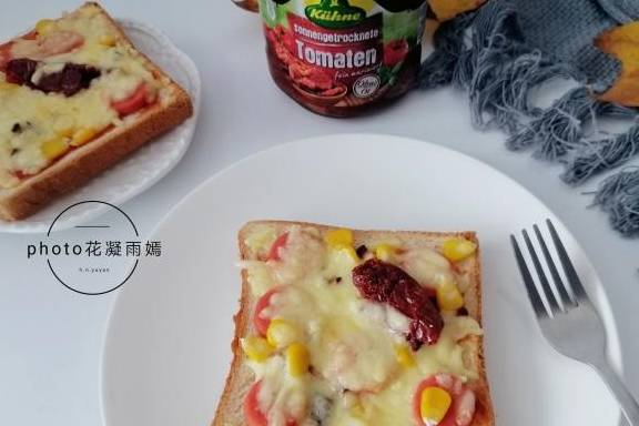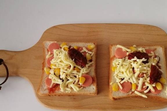 食材:面包片4片、玉米粒、火腿肠、香菇、番茄酱、马苏里拉奶酪、腌番茄