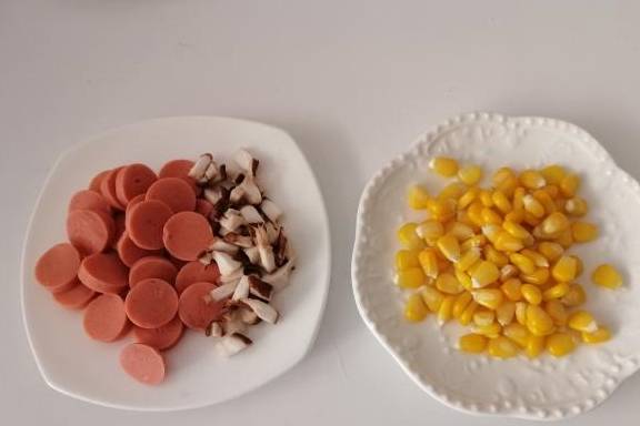 第二步:火腿肠切片,香菇切丁,玉米煮熟备用,现在还有新鲜玉米,我们可以多买一些然后煮熟放冰箱冷冻,随时都有玉米吃了。