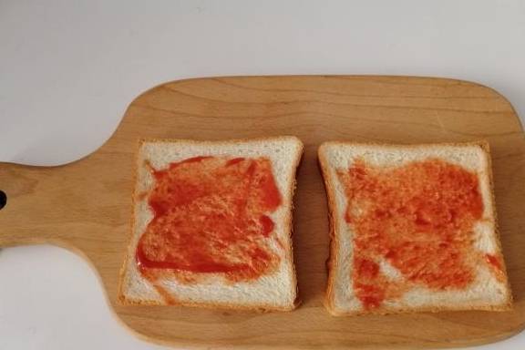 第三步:把面包片上涂满番茄酱,或者披萨酱,家里有什么就用什么,咱们图的就是个方便。