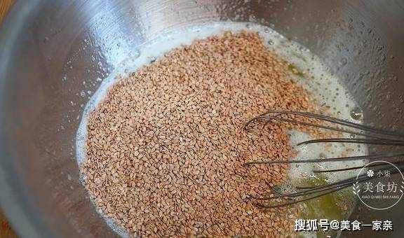 第三步:搅拌好的蛋液里加入220克芝麻,边倒边搅拌,充分的搅匀。